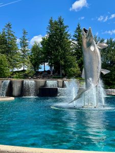 Nous arrivons à Campbelton sous un grand soleil. Cette petite ville, située le long de la baie des Chaleurs, est vraiment agréable. Ici, le saumon est roi : on en retrouve en décoration un peu partout, clin d’œil à la pêche sportive qui fait la renommée de la région.