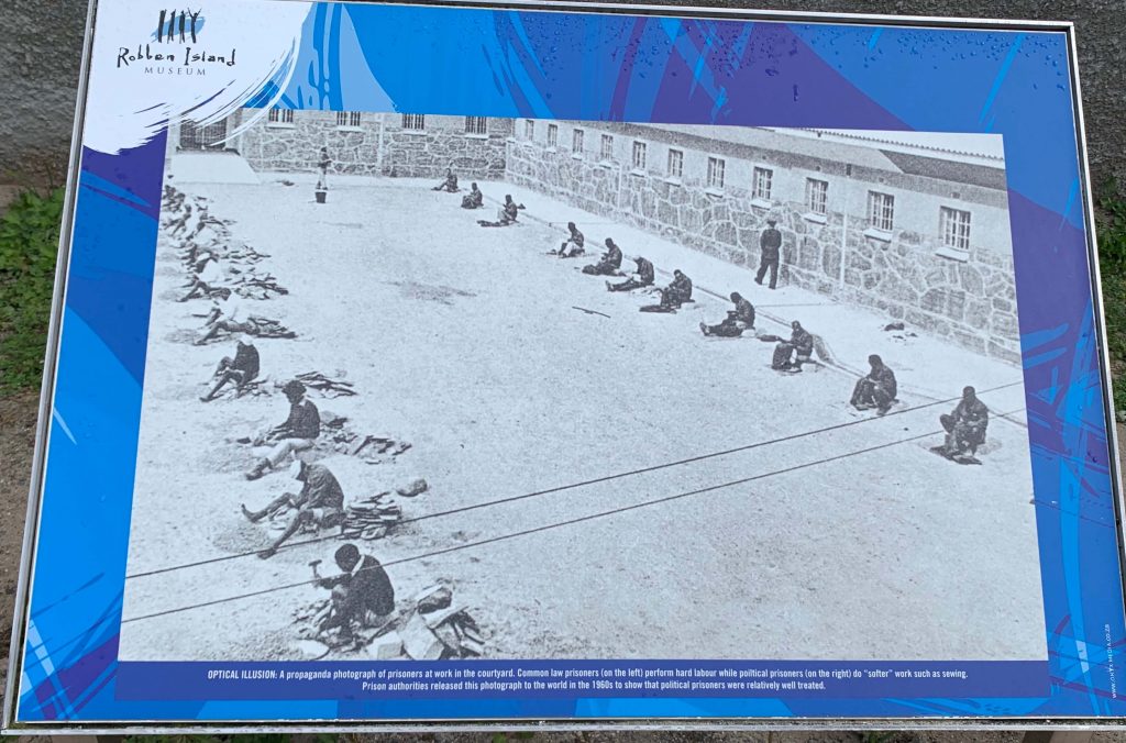 Notre visite de Robben Island a été marquante. Nous avons pris un ferry depuis le Waterfront pour cette île chargée d’histoire. Un ancien détenu nous a guidés à travers la prison, expliquant les conditions de détention difficiles. La cellule de Nelson Mandela était particulièrement émouvante. Il fut interné sous le numéro 46664 ce qui signifie qu’il a été le 466 ème prisonnier entré en 1964. Il est resté 18 ans sur l’île au cours de ses 27 ans d’incarcération. Il fut relâché en 1990. C’est en 1996, cinq années après la fin officielle de l4apartheid que l’île de Robben Island cesse définitivement ses fonctions de prison et devient un musée l’année suivante. Tout est conservé tel quel.
