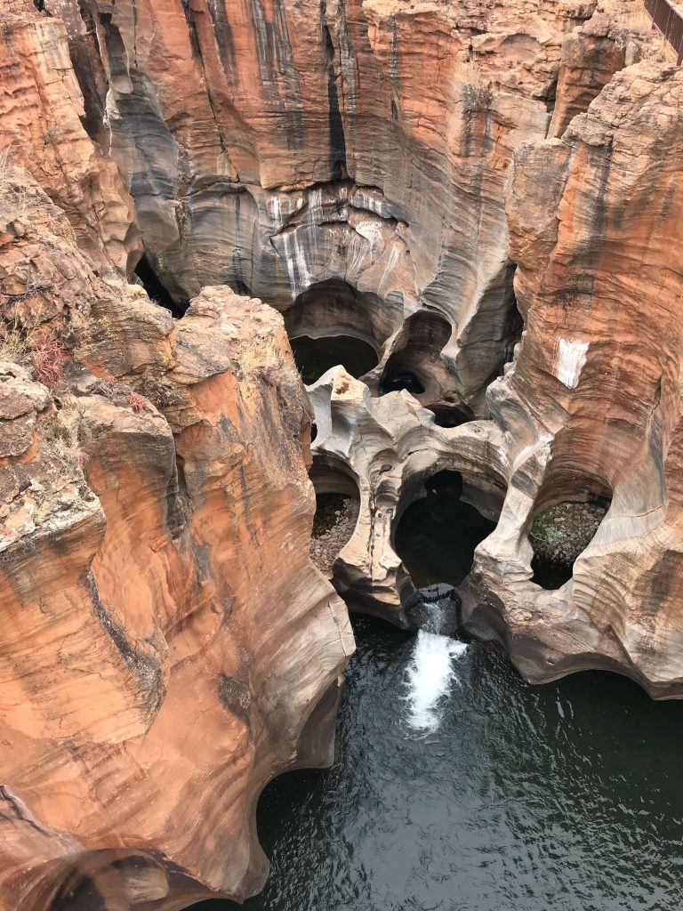 En quittant le parc Kruger, nous découvrons le Blyde River Canyon. Malgré la pluie, les Three Rondavels et les Bourke’s Luck Potholes étaient impressionnants. Les formations rocheuses sculptées par l’érosion offrent un paysage spectaculaire, même par temps nuageux.
