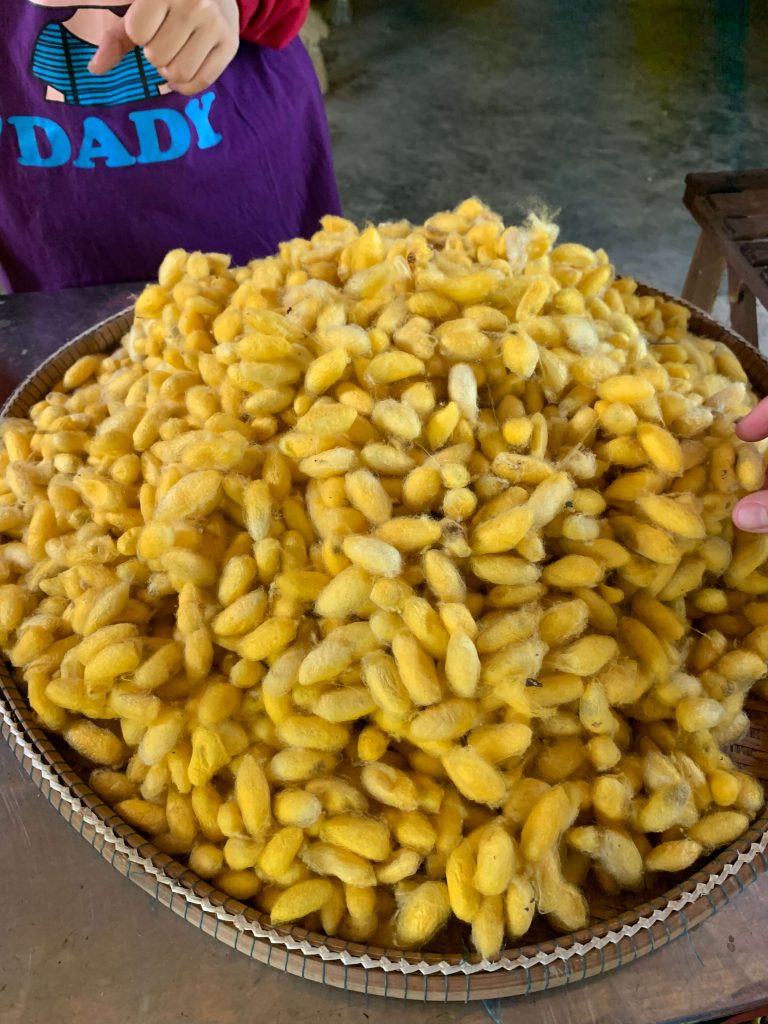 Nous avons pris un tuktuk jusqu’à l’embarcadère de Phnom Penh pour nous rendre sur l’île de Koh Dach. La traversée rapide nous a menés à une ferme à soie où nous avons découvert le processus fascinant de production de la soie, de la reproduction des vers à soie jusqu’au tissage final.