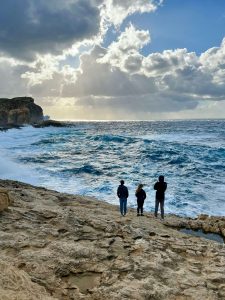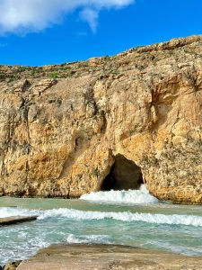 Direction ensuite Dwejra Bay, un lieu connu pour ses formations géologiques uniques, dont le Blue Hole, une piscine naturelle en pleine mer. Nous avions espéré faire un tour en bateau, mais avec ce vent, c’était mission impossible. Une fois sur place, le spectacle des vagues s’écrasant sur les falaises était à couper le souffle. Nous avons passé un long moment à admirer la puissance de la mer, fascinés par cette beauté sauvage.