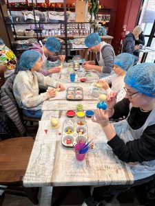 Notre matinée a débuté en douceur avec une activité créative dans une chocolaterie. Le but ? Décorer un sujet de Noël en chocolat. Tout le monde démarrait avec la même base : deux sphères et un disque en chocolat blanc. Sur la table, une palette gourmande de chocolat coloré nous attendait, et l’animatrice nous a fourni quatre teintes supplémentaires pour peindre nos créations.
