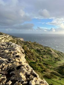 Ensuite, direction les célèbres falaises de Dingli. Situées sur la côte ouest de Malte, elles culminent à 253 mètres, ce qui en fait le point le plus élevé de l’île. Avec le vent qui soufflait ce jour-là, l’expérience était à la fois impressionnante et vivifiante. Heureusement, les rafales allaient dans le bon sens, nous poussant vers l’intérieur des terres plutôt que vers le vide. Devant nous, la mer était déchaînée, offrant un spectacle fascinant avec ses vagues puissantes s’écrasant contre les rochers.