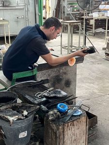 Notre première destination est le village des artisans, un endroit que nous avions déjà exploré en début de séjour. Cette fois, nous avons une mission : Louna a repéré un petit souvenir qui lui avait échappé lors de notre première visite. Grand bien nous en a pris de revenir, car nous avons eu la chance d’assister au travail des souffleurs de verre. Leurs gestes précis et leur savoir-faire ancestral étaient fascinants à observer. Saviez-vous que cet art remonte à l’Antiquité, perfectionné notamment par les Romains, avant de se transmettre au fil des siècles ?